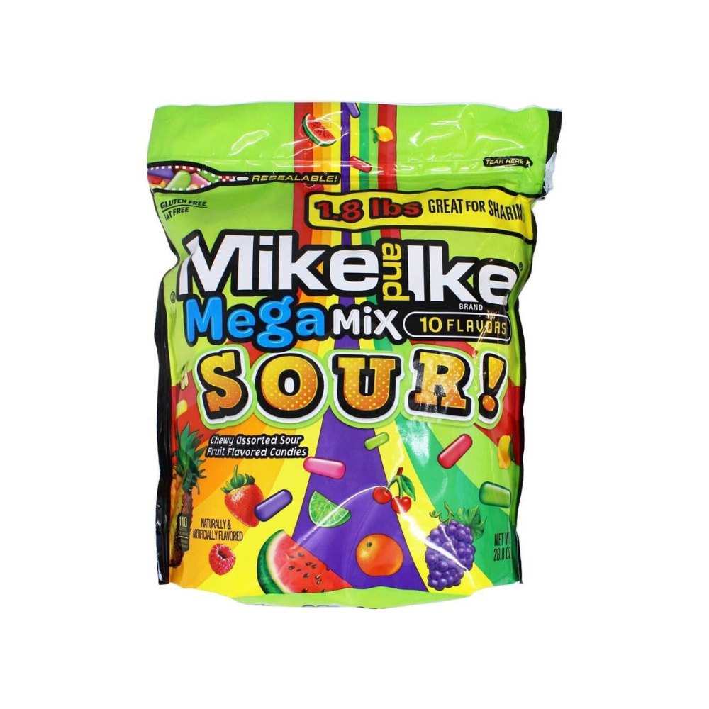 Fuel your day with the FRUCHEWY flavors of Mike and Ike Mega Mix Sour. Whether you're powering through a weekend gaming marathon, a watch party, or simply on the go, this candy adds zesty sour punch twists to your day that are too good to keep to yourself.